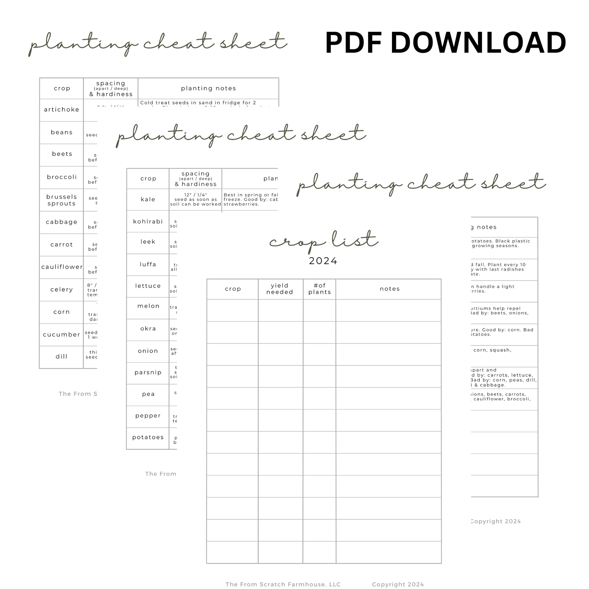 - planting cheat sheets for several crops (plant spacing, when to plant, and planting notes)